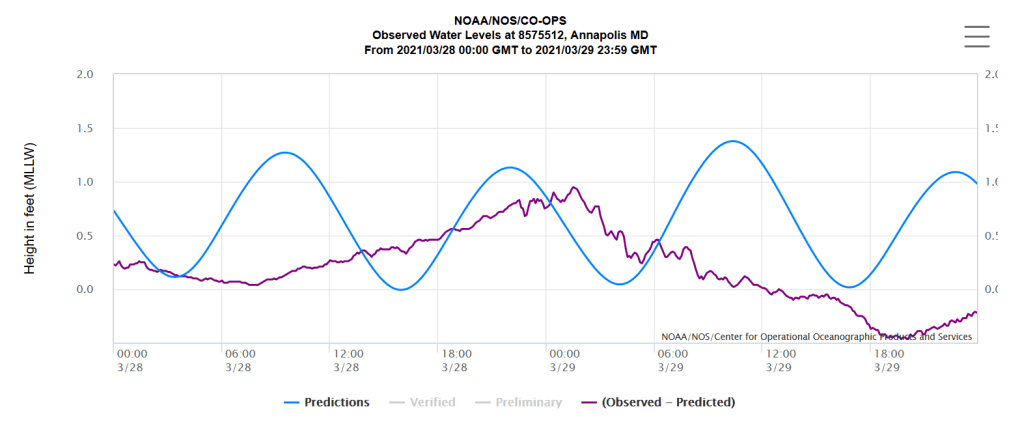 Here is an example of the predicted tidal range and the observed range over the same time period. If you peruse this site – https://tidesandcurrents.noaa.gov/waterlevels.html?id=8575512 – you can see that the predictions almost never match the observed. Keep in mind this station is at the Naval Academy basin in the Severn River, which has its own micro conditions with wind and runoff.