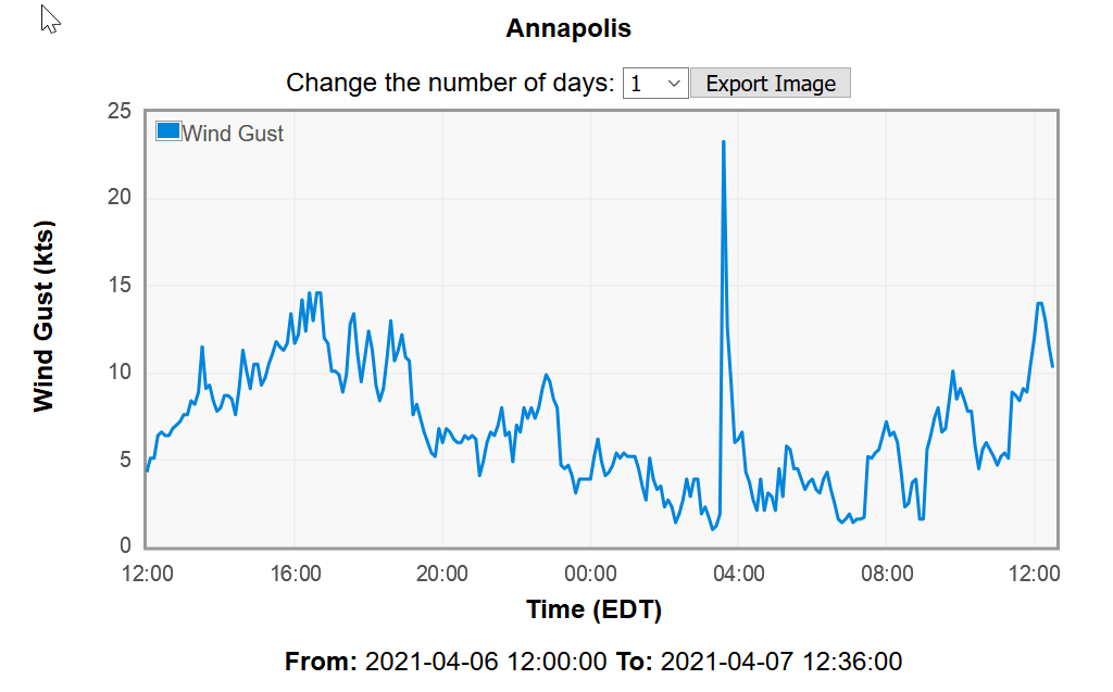 Chesapeake Bay Interpretive Buoy System/Annapolis – This buoy is essentially on the race course. You can note it by the yellow color. It has real time observations of many pieces of data and can show graphs for 1, 7, and 30 days. The wind sensors are near water level so wind strengths are what we would perceive on a Snipe.