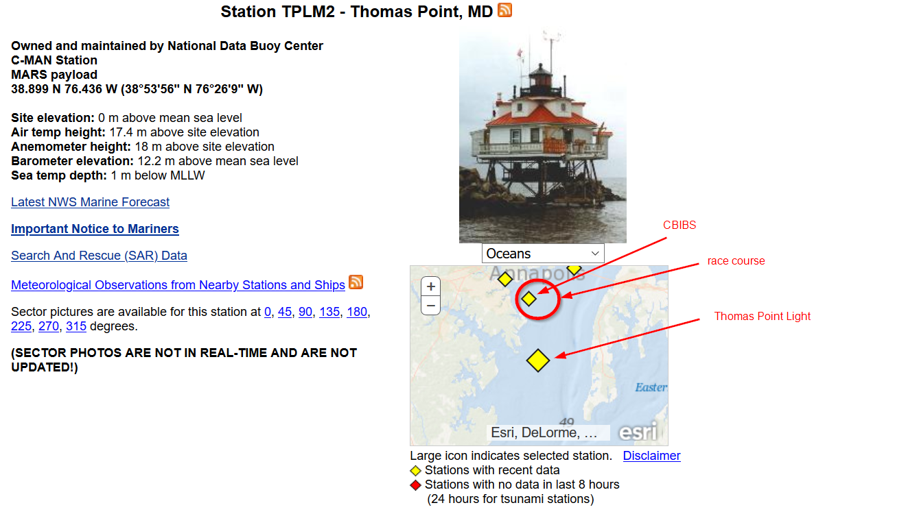 Chesapeake Bay Interpretive Buoy System/Annapolis – This buoy is essentially on the race course. You can note it by the yellow color. It has real time observations of many pieces of data and can show graphs for 1, 7, and 30 days. The wind sensors are near water level so wind strengths are what we would perceive on a Snipe.