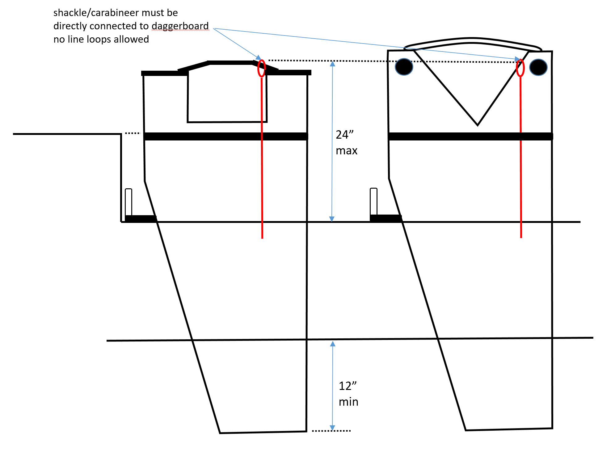 - The length of the retaining line from the top of the daggerboard trunk to the inside surface of the clip can not be longer than 24″.