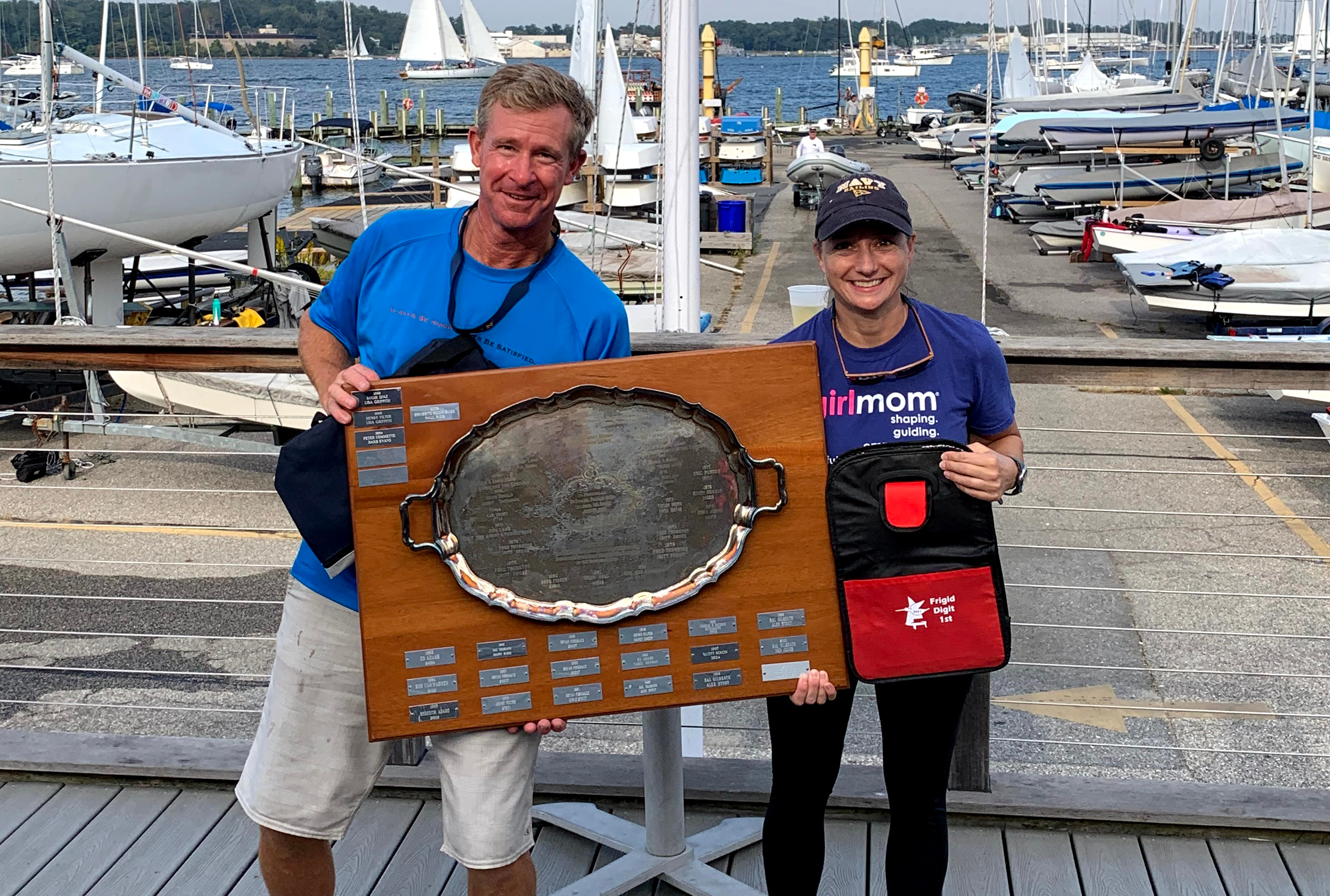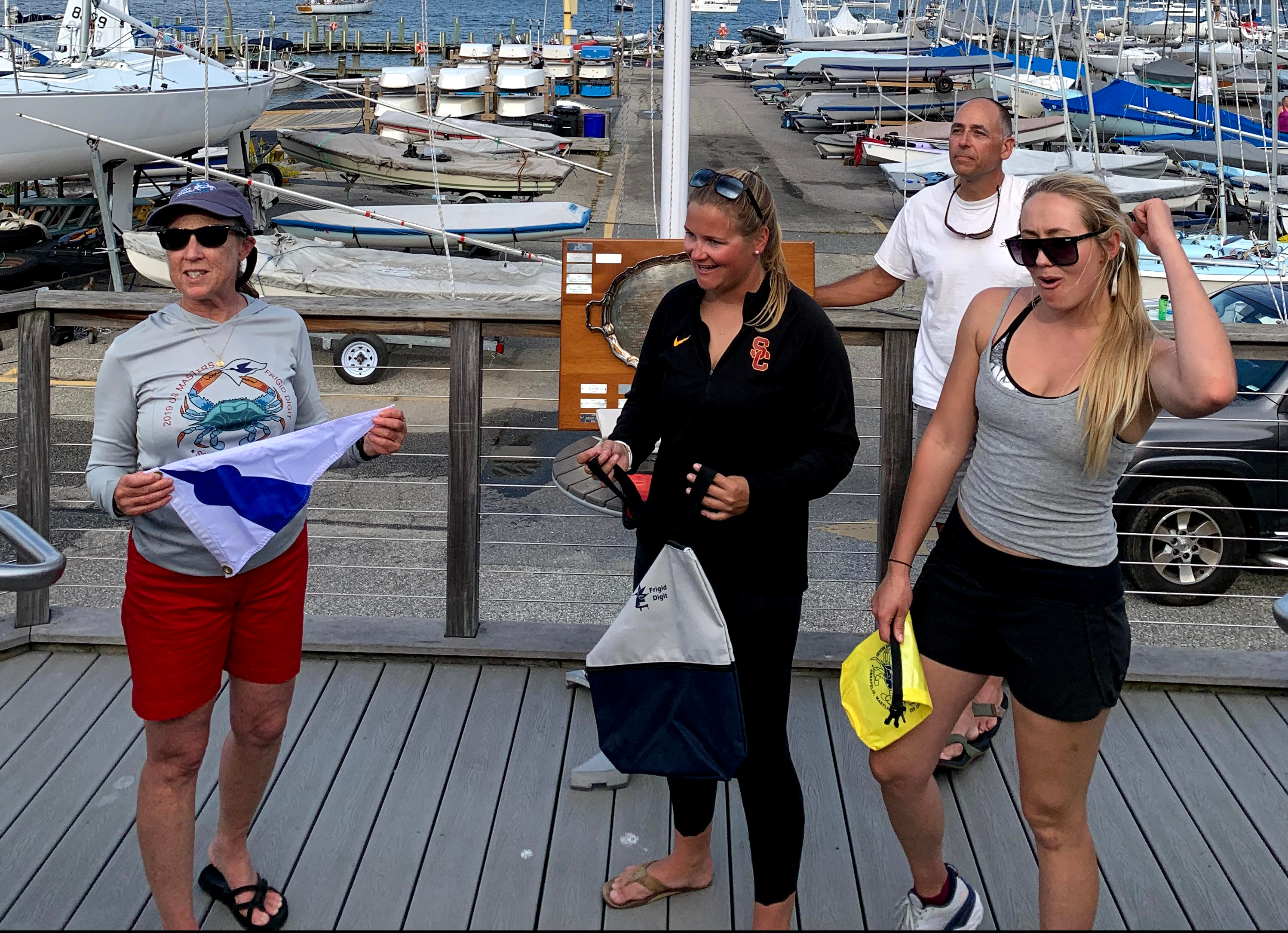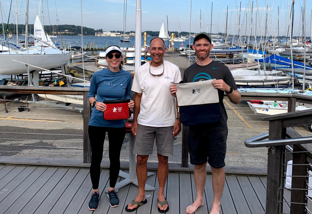 Sunday brought another beautiful morning, but iffy breeze early. We had decided to start again at 11am rather than our traditional hour earlier, a good thing because PRO Charlie Krafft postponed ashore for another hour while the southerly breeze filled in. We finally got out for a 12pm start in about 5-8 knots for three more races. Once racing got going the breeze increase several knots to the point where it was possible to make way through the pleasure boat chop. Had it stayed closer to 5 knots it would have been really awful being on the wrong side of where the Snipe “perks up”. But thankfully, that wasn’t the case and we completed three more races just before our drop dead time of 3pm. Gavin O’Hare sailing with Erica Kraft as Holly was on Soccer duty, was the guy on fire with a 1,2,1. Unfortunately, Hal had to depart Saturday for a work commitment so he dropped down the standings. The rest of the top finishes were distributed between the Keenes, Ramirez/Hermida, Reinke/Damley-Strnad and the Plines. As a result, Gavin ended up winning the event by 10 points followed by Ramirez/Hermida, Andrew/Kristen Keene, Reinke/Damley-Strnad and Alex/Lisa Pline in 5th. Sarah Alexander/Hollis Barth were the top U30 team and Lisa presented them with an SSA burgee to exchange with the host club of the 2021 Snipe Womens World Championships next week in Sao Paulo Brazil. Good luck!!