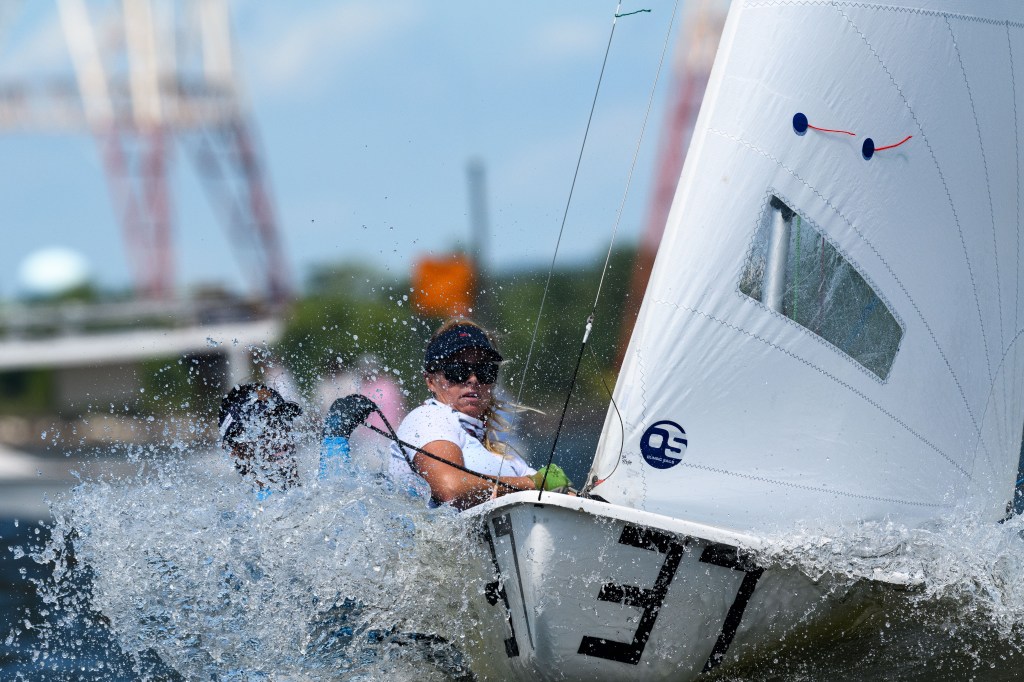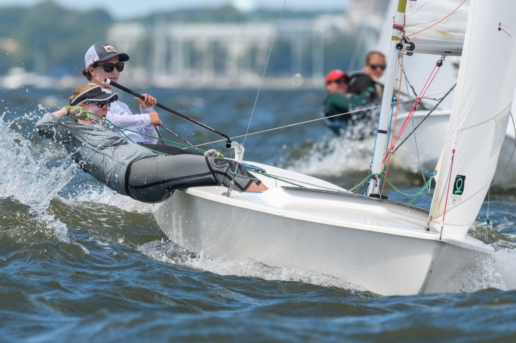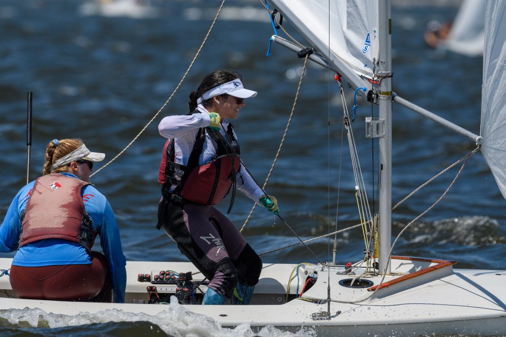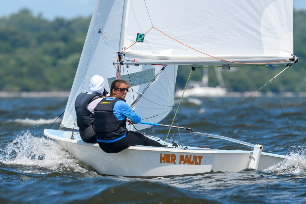 USNA Alum teammates Mary Hall Baker (USNA ’15)/Marissa Lihan Milliken (USNA ’14) came out strong with a 2-1-1 on the first day, followed closely by veteran Miami Snipe sailor Taylor Scheuermann with Boston crew Julia Marsh Rabin with a 3-2-2. Gracie Howie/Katja Sertl ended the day in 3rd with 4-4-3 with locals Sarah Alexander/Shira Golub (who won the first race of the day) in 4th. Scheuermann and Howie were in peak training mode as they will be leaving in a week to represent the USA at the 2022 Snipe Worlds in Portugal, Scheuermann as a skipper, Howie as a crew.