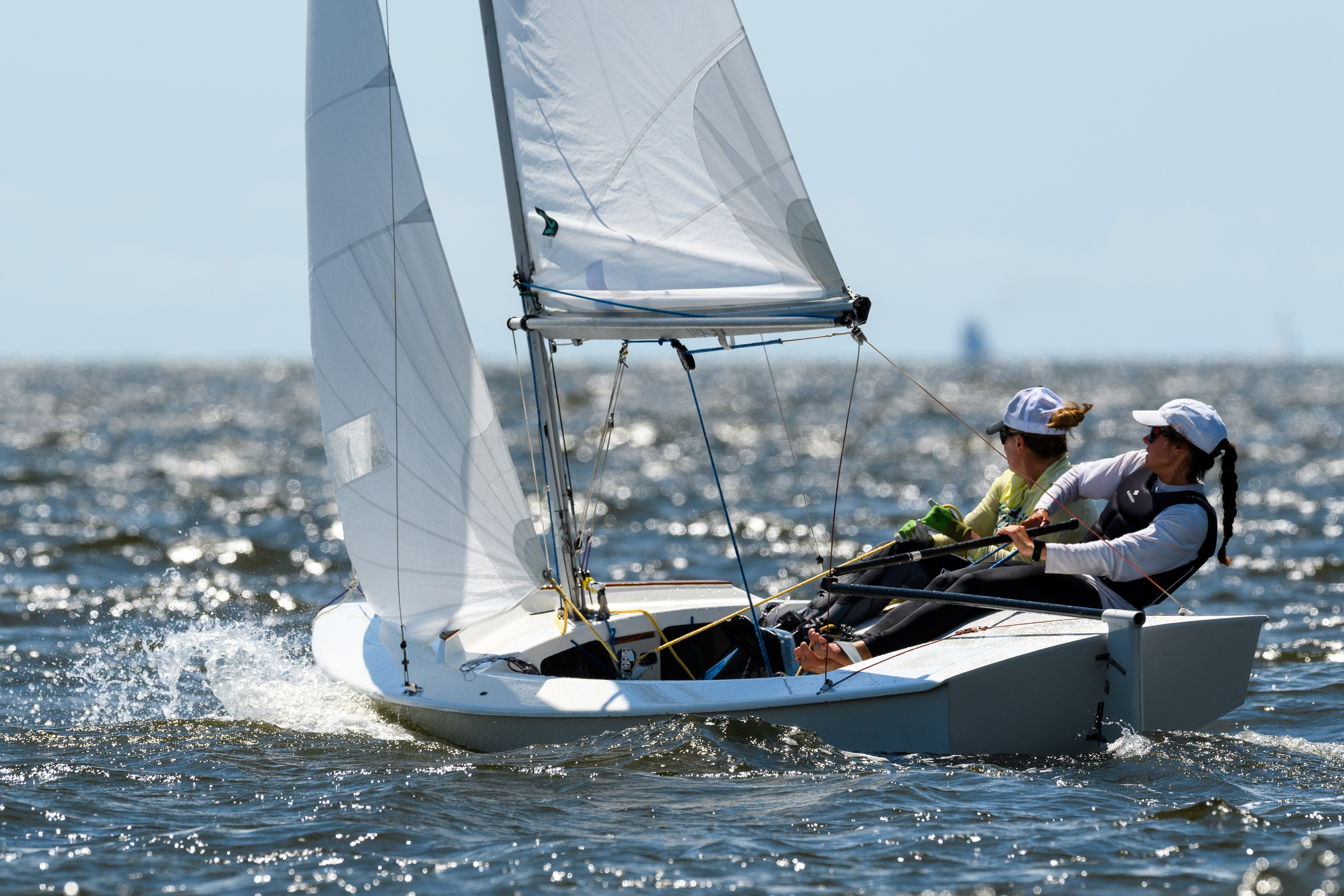USNA Alum teammates Mary Hall Baker (USNA ’15)/Marissa Lihan Milliken (USNA ’14) came out strong with a 2-1-1 on the first day, followed closely by veteran Miami Snipe sailor Taylor Scheuermann with Boston crew Julia Marsh Rabin with a 3-2-2. Gracie Howie/Katja Sertl ended the day in 3rd with 4-4-3 with locals Sarah Alexander/Shira Golub (who won the first race of the day) in 4th. Scheuermann and Howie were in peak training mode as they will be leaving in a week to represent the USA at the 2022 Snipe Worlds in Portugal, Scheuermann as a skipper, Howie as a crew.