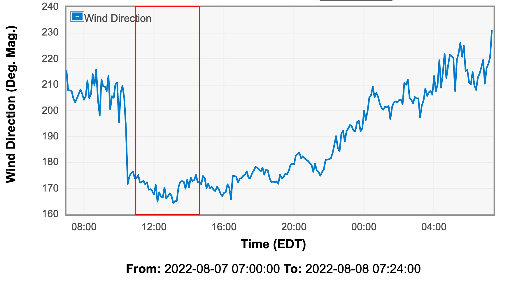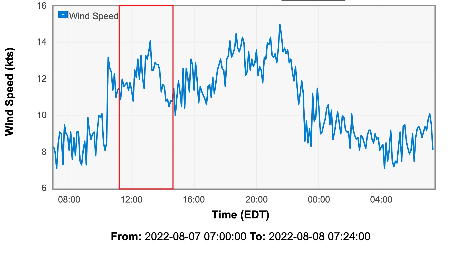 Sunday wind speed and direction from the CBIBS buoy which is essentially in the middle of the course. Racing time is highlighted in the red boxes. The winds on Saturday were similar.