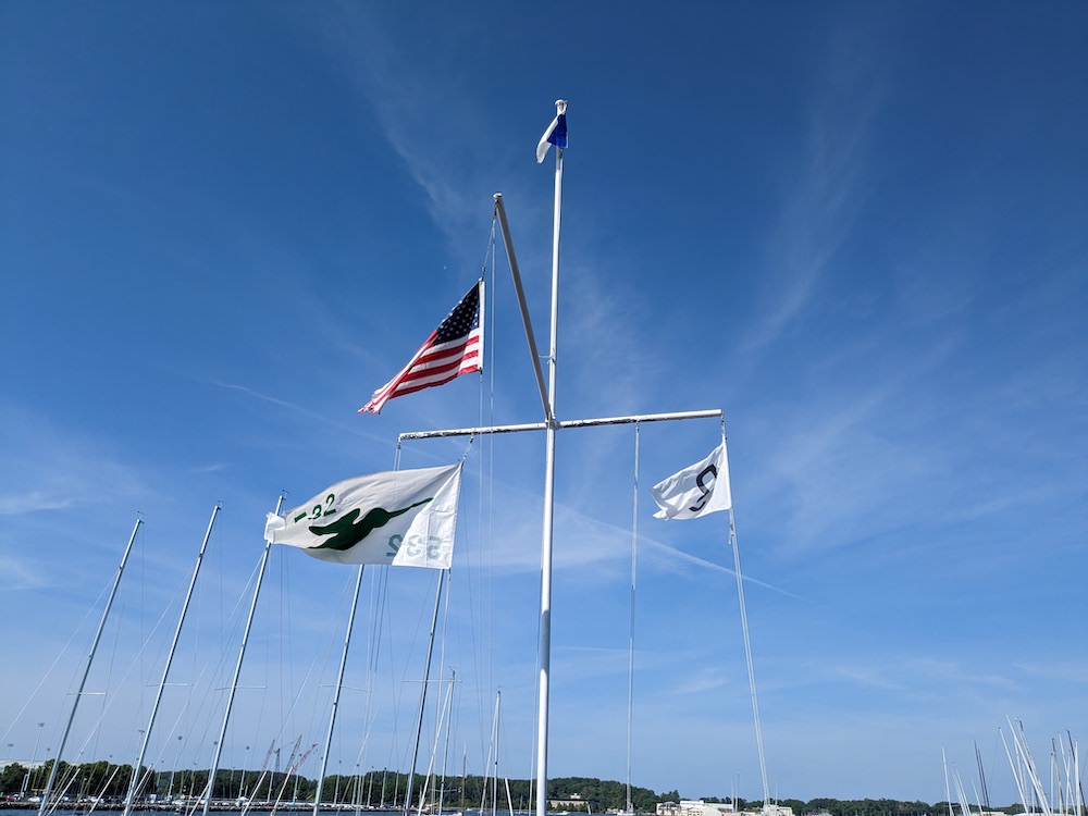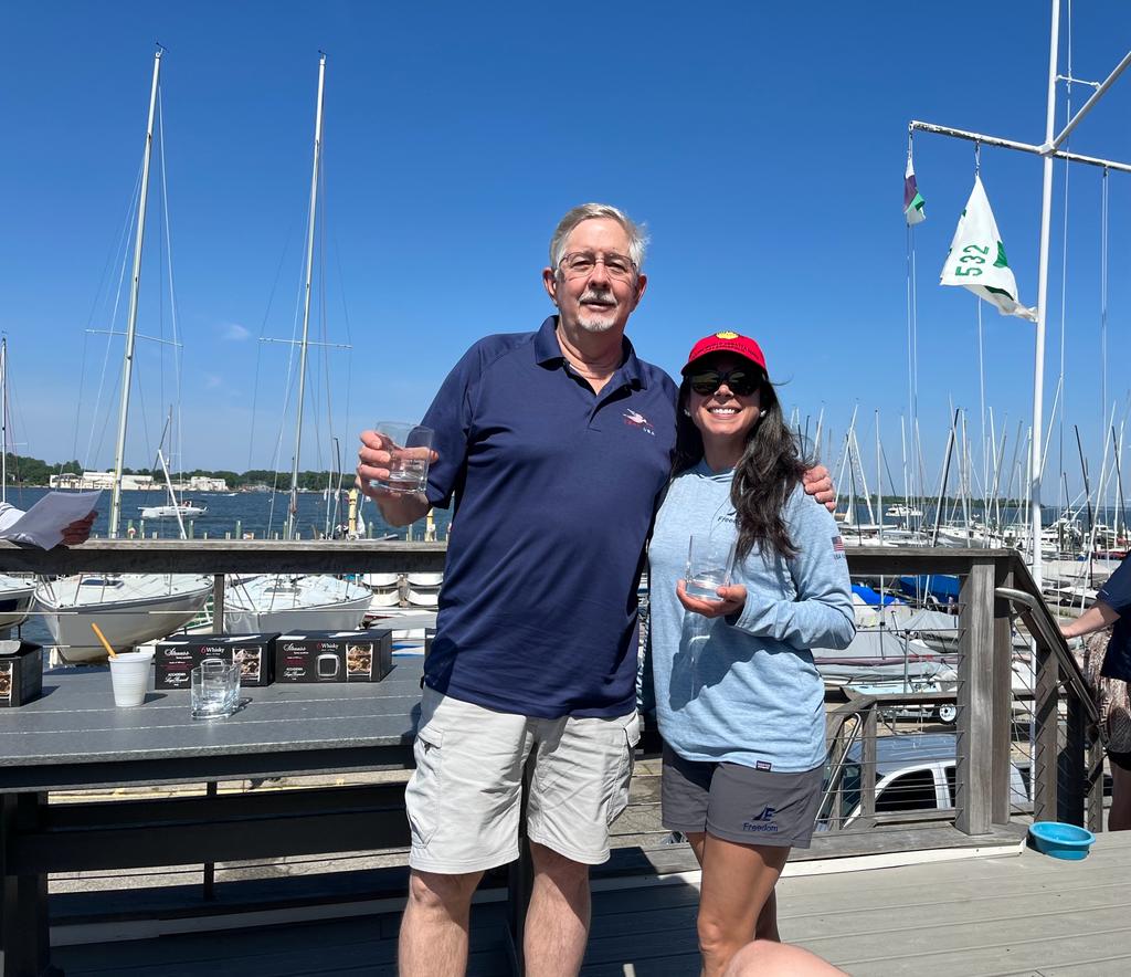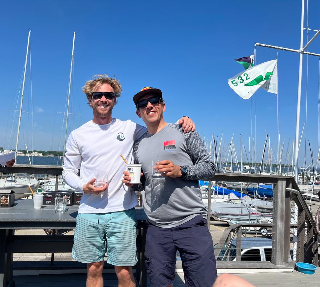 By the third race, the bottom was quickly falling out of the breeze and as that happens typically the breeze starts to shift around to the east as high pressure settles in so opportunities to go right start to emerge. But beware, it’s not a sure thing. This was exactly the case and those who stuck to the “go left” found themselves in a world of hurt. Midway through the race, the breeze started to shut off making downwind against the current slow going. However, there were still a few puffs from the left early which really hurt those that assumed the shift was persistent and they fell into a big hole after jibing at the weather mark and when it finally came back from the right towards the end of the leg, it was too late. By the second beat, the wind was definitely right to stay. The final finishes were a bit jumbled compared to the first two races, but the top 3 ended up in a tie breaker at 9 points. Fortunately for Blodgett/Capellin, the two firsts put them on top and it came down to who beat who in the last race with Griffith/Bruno in second and Adam/Stout in third. Fourth through sixth were also close, each a point apart. We decided to call it quits after three races as the breeze was unstable and with a 3pm drop dead time, we didn’t think the developing se breeze would settle there before that point.