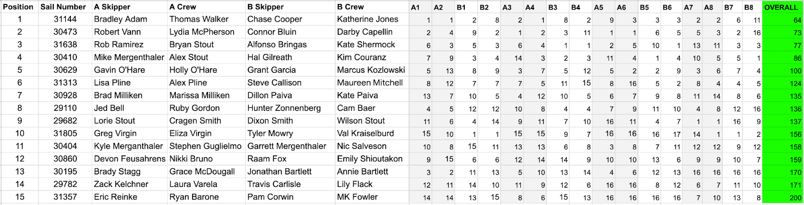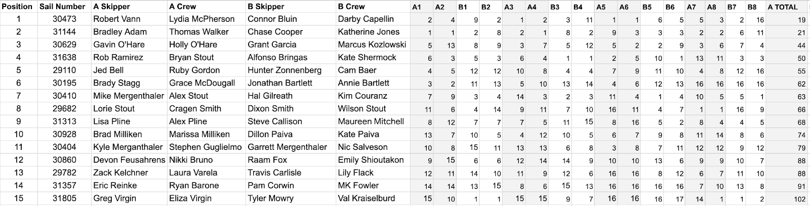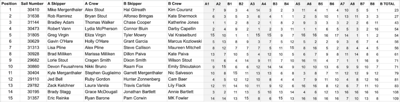 Ultimately, consistency ruled the weekend as is very typical with college-style regattas with many shorter races that do not include a discard. After 16 races only 13 points separated the top three spots on the overall scoresheet with the team of Bradley Adam/Thomas Walker (A) and Chase Cooper/Katherine Jones (B) taking the top overall spot, Robert Vann/Lydia McPherson (A) and Connor Bluin/Darby Capellin (B) in second and Rob Ramirez/Bryan Stout (A) and Alfonso Bringas/Kate Shermock (A) in third. Additionally, the A Teams were scored as the SSA Snipe Summer Series.