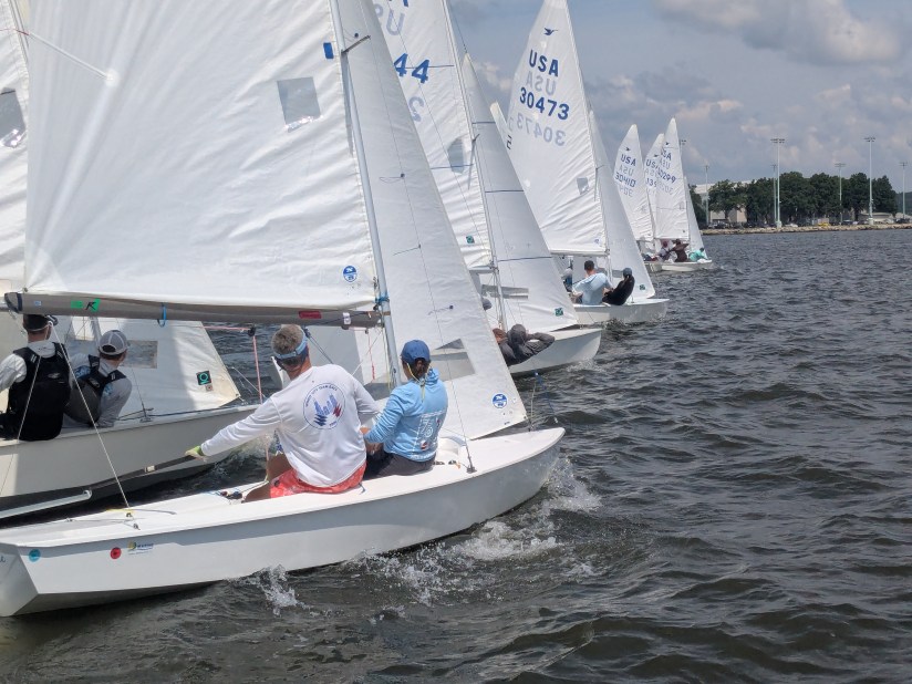 The course was set right off SSA in the Severn River – this is the area we typically run high school and college regattas – to facilitate quick A/B rotations. The courses were 2 lap W/L, with a projected length of about 20 minutes. Racing was very similar both days starting with a light northerly, eventually shifting around to the northeast and east as the temperatures warmed and the summer thermal effects drew a slight sea breeze. But as usual this shift does not happen smoothly, rather in fits and starts as the thermal and the gradient breeze battle each other. These conditions made for very tricky sailing with the shifts oscillating typically 45 degrees and the wind strength nominally 5-6 knots, and at times dropping to almost zero. To make the sailing even more challenging, the boat traffic (and chop!) increased as the racing entered the afternoon where every type of watercraft from paddle boards to commercial cruise boats went right through the course. It is what we call a “Chamber of Commerce kind of day”.